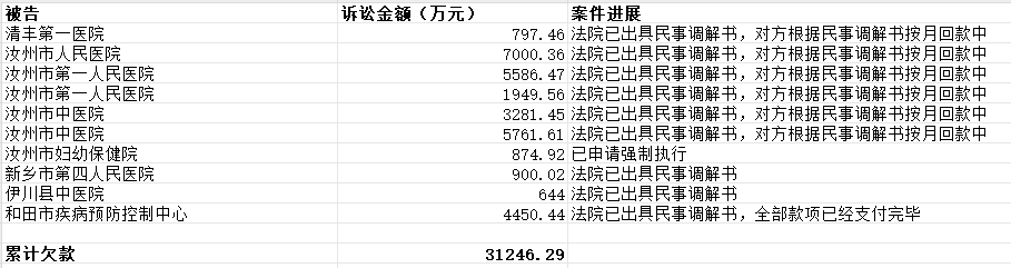 据了解,近段时间,医药流通商海王生物把汝州市第一人民医院、汝州市人民医院等8家二级以上公立医疗机构告上了法庭,要求他们抓紧支付自己总额近3.12亿元的药品、耗材回款。